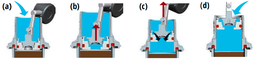 (a) Začněte se spuštěnou pákou a naplňte spařovací válec vodou po okraj. (b) Zvedněte páku natolik, aby se uvolnil vřetenník a otevřel ventil, a nechte vodu zaplnit prostor pod hlavou (pohybujte pákou, abyste minimalizovali vzduchové kapsy). (c) Pokračujte v pomalém zvedání páky a voda bude procházet ventilem do spařovací komory. (d) Doplňte komoru otvorem vytvořeným mezi vřetenníkem a pístem, jakmile je páka zcela zvednutá.